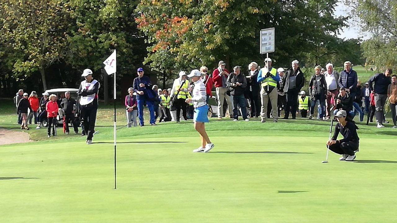 Esther Henseleit einzige deutsche Teilnehmerin beim solheim junior cup hat soeben ihr Einzel gewonnen.