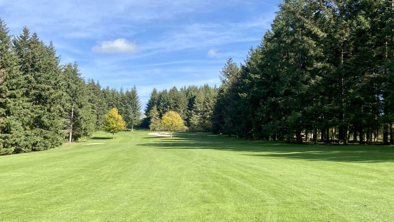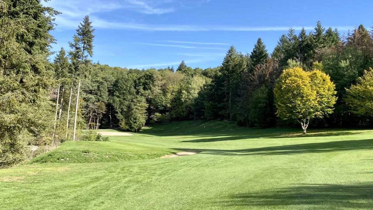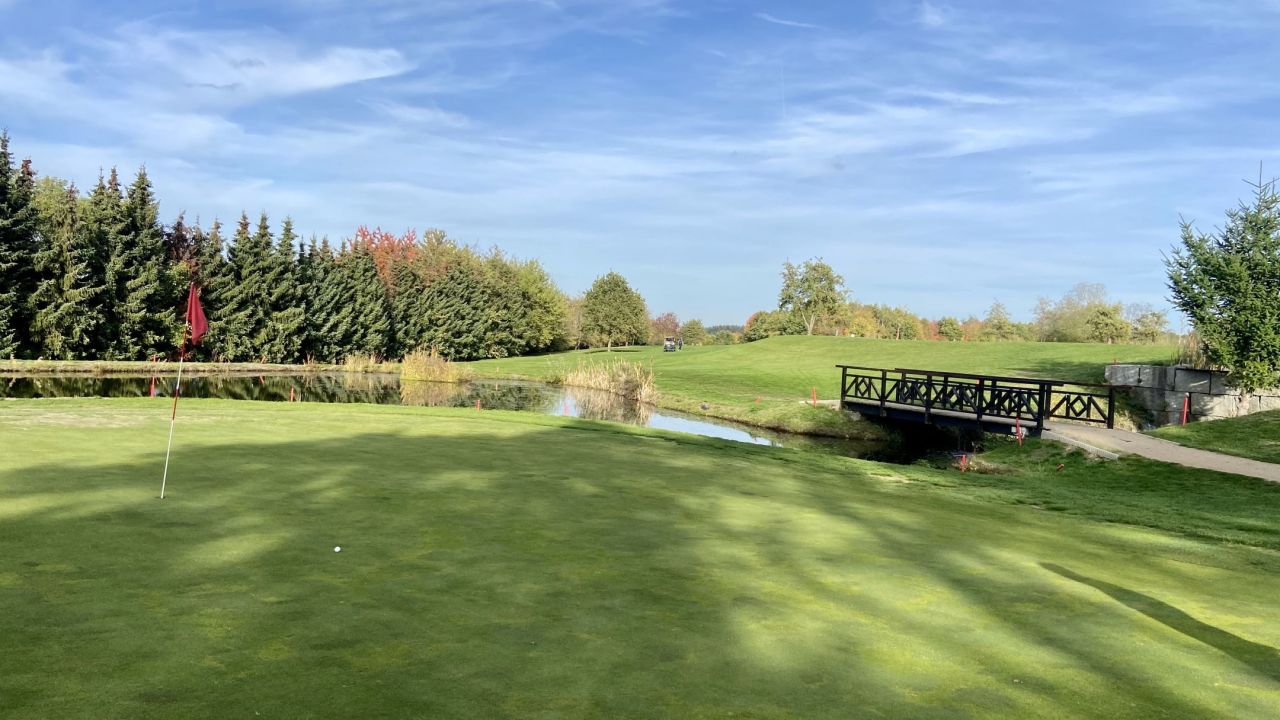 Abschlag von der Bahn 5 kleiner Schwenk über dan Platz , alles grün, die Sonne scheint. Toller Tag auf der ...