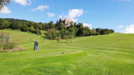 Bahn 3 - Par 3 - 107 Meter (gelb/rot). Ein kurzes aber sehr anspruchsvolles Par drei, unterhalb der Hohenzoller Burg. Bergauf, das Grün geschützt durch zwei Bunker benötigt man einen präzisen Schlag um sich eine Birdie- oder Parchance zu erspielen.