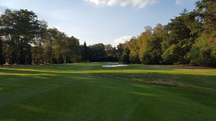 Das Bild zeigt Bahn 2 nach dem Umbau in diesem Jahr. Mit dem strategisch gut platzierten Wassergraben diagonal in der Mitte des Fairways verlaufend, wird das Loch gerade für Longhitter gut verteidigt. Die Optik lädt zum Verweilen ein.