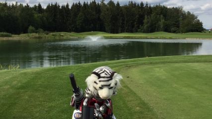 Unser Loch 17, ein Par 3 das nur 161m lang ist, jedoch mit einem großen Teich den es zu überqueren gilt.