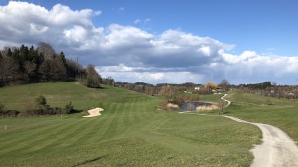 Auf dem Bild ist der 1. Abschlag bei der roten 9-Loch Runde zu sehen. Was man nicht sieht ist das Green, welches hinter den Bäumen liegt. Fies ist an der Bahn, dass man die letzten 100m rauf spielen muss. Schaft man es nicht auf das Green, rollt einem...