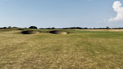 Loch 15 (Par 4, Herren 367 m, Damen 348 m). Den Abschlag muss man durch eine enge Gasse in die Landezone schlagen. Von dort bietet sich ein grandioser Blick auf das ondulierte Grün und die mächtigen Dünen dahinter.