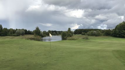 Prächtige Niederrhein Natur : Blick über den Teich von Bahn 8 auf die 7 von Golf International Moyland