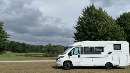 Wohnmobil Stellplatz fast direkt am Grün der Bahn 7 - heute gesehen auf dem Platz von Golf International Moyland am ...