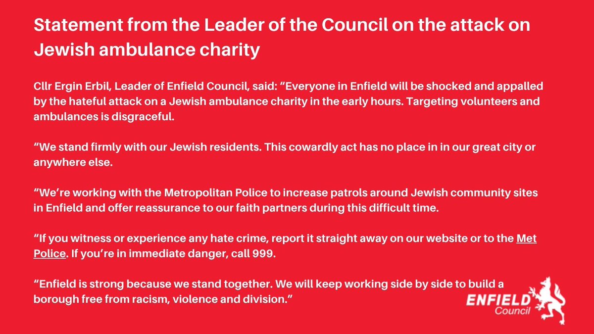 Cllr Ergin Erbil, Leader of the Council, has released a statement on the appalling attack on ambulances belonging to a Jewish community charity. If you witness or experience hate crime, report it on o...
