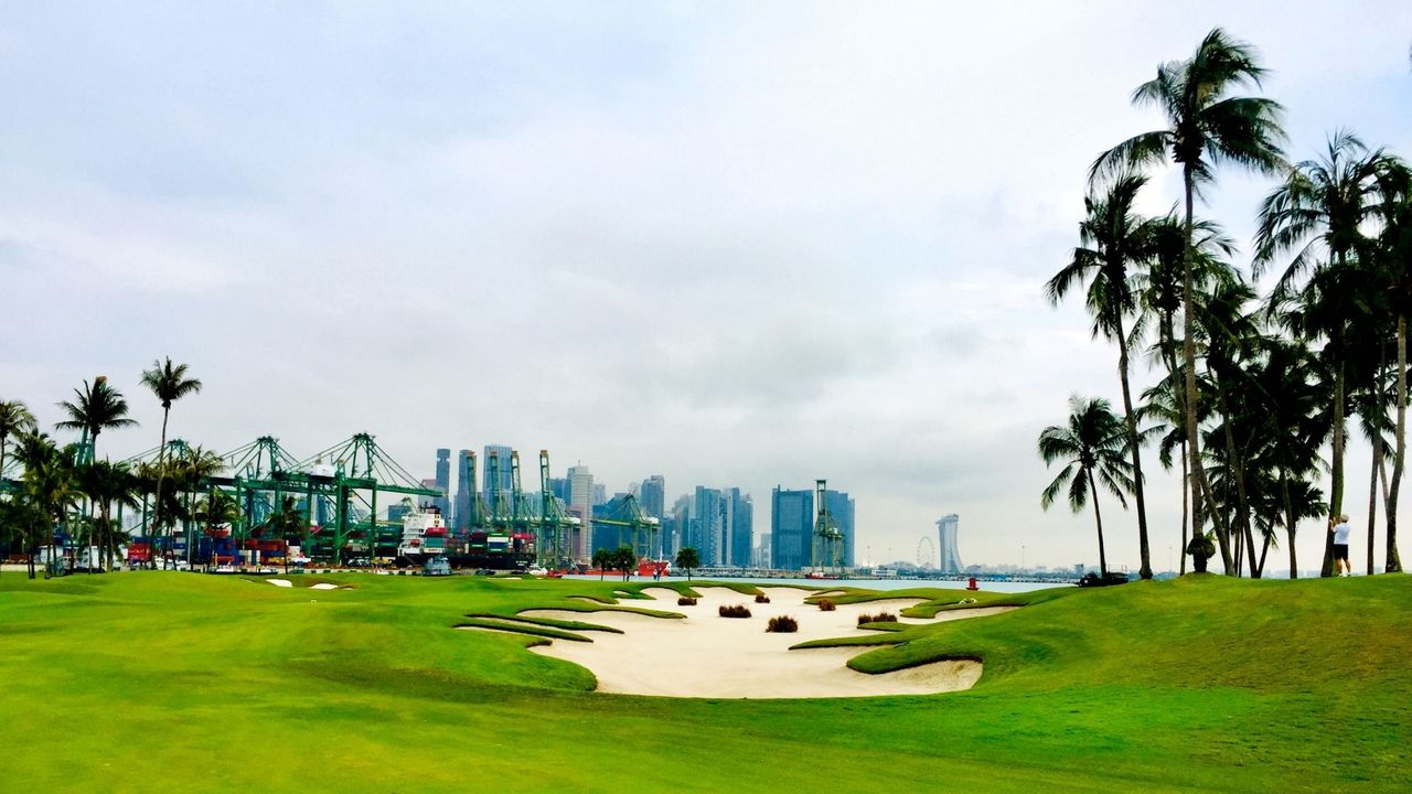 Dabei sind die Sichten derart szenisch und splendide, dass man auf den Abschlägen oder beim Warten auf den Mitspieler schon mal das Trinken vergessen kann. Während sich vom ordentlich ondulierten New Tanjong stellenweise weit übers Areal und die Insel sowie aufs Schiffe-übersäte Meer schauen lässt, verlaufen die spektakulärsten Bahnen des Serapong, die Löcher 2 bis 7, rund um eine Lagune und vis-à-vis von Singapurs quirligem Hafenbereich. Derweil flirrt in der Ferne die Skyline von Downtown mit der signifikanten Silhouette des Marina Bay Sands im Hitzedunst.