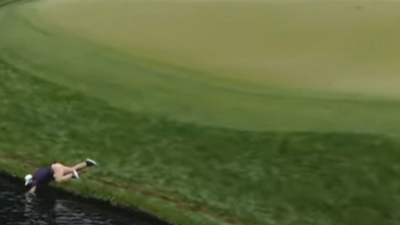 Doch ein Volunteer behielt den Ball des Nordiren genau im Blick. Sobald dieser eingelocht hatte und sich auf den Weg zur nächsten Bahn machte, kroch der Volunteer bäuchlings zum Wasser, lehnte sich weit hinunter und fischte mit dem Arm nach der wertvollen Trophäe. Bereits nach wenigen Sekunden hatte er offenbar Erfolg, steckte den Ball in die Hosentasche und ging davon, als sei nichts gewesen. Die Aktion sorgte für skurriles Videomaterial, das prompt in den sozialen Medien die Runde machte.