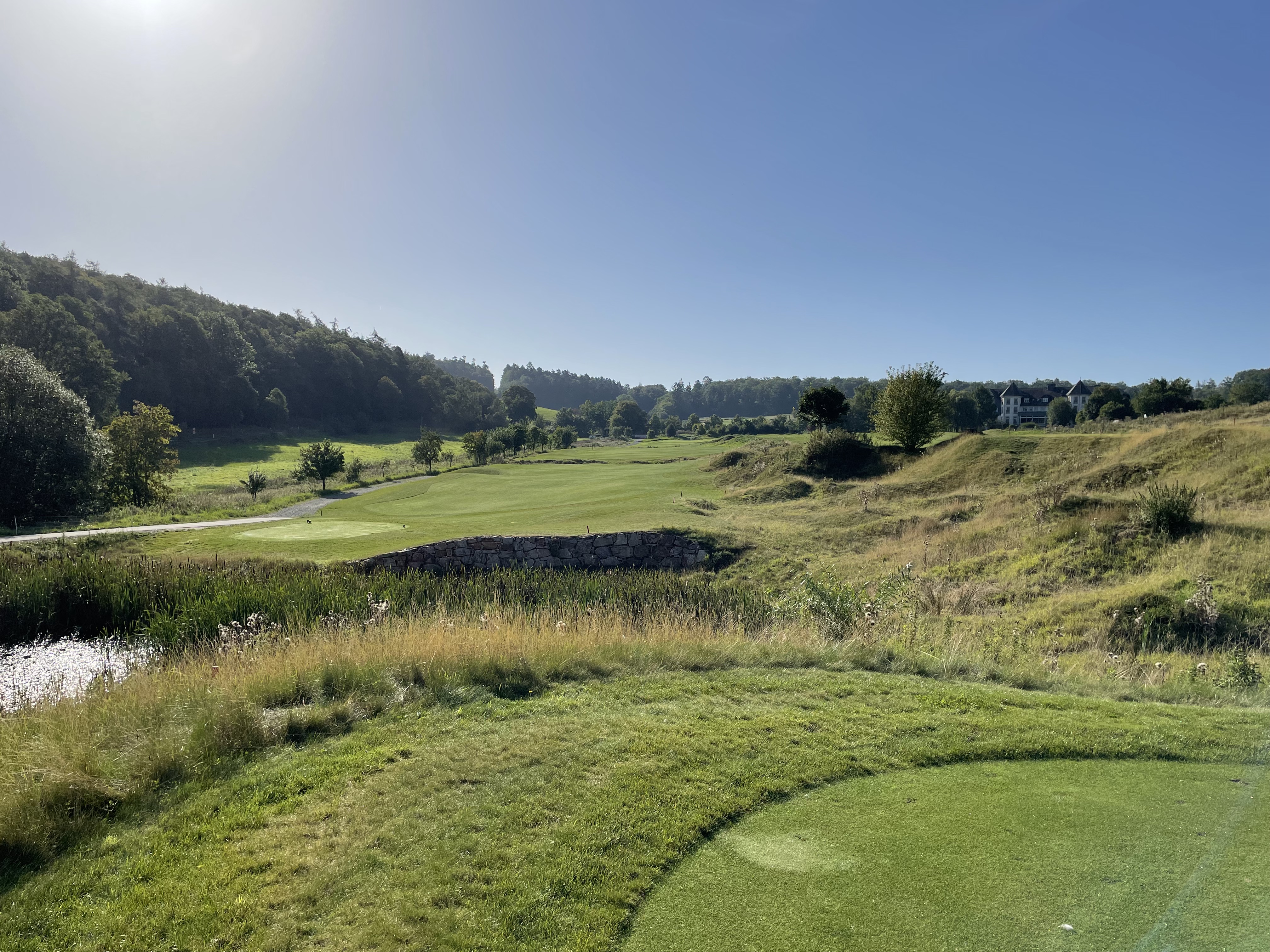 Es ist ein phänomenaler Parcours auf minimalem Raum: Dem Architekten Christian Althaus ist im Hofgut Georgenthal das Kunststück gelungen, auf einem schüsselförmigen Areal von lediglich 48 Hektar einen 18-Loch-Kurs im Links-Design plus 3-Loch-Parcours und Übungsanlagen unterzubringen, ohne das UNESCO-Weltkulturerbe der historischen Grenze Limes zu sprengen. „Die Landschaft hier im Untertaunus hat einen Charakter. Der Golfplatz sollte keinen Bruch darstellen“, erklärt Hofgut-Chefin Brita Hankammer. „Daher die etwas rauere Anmutung.“