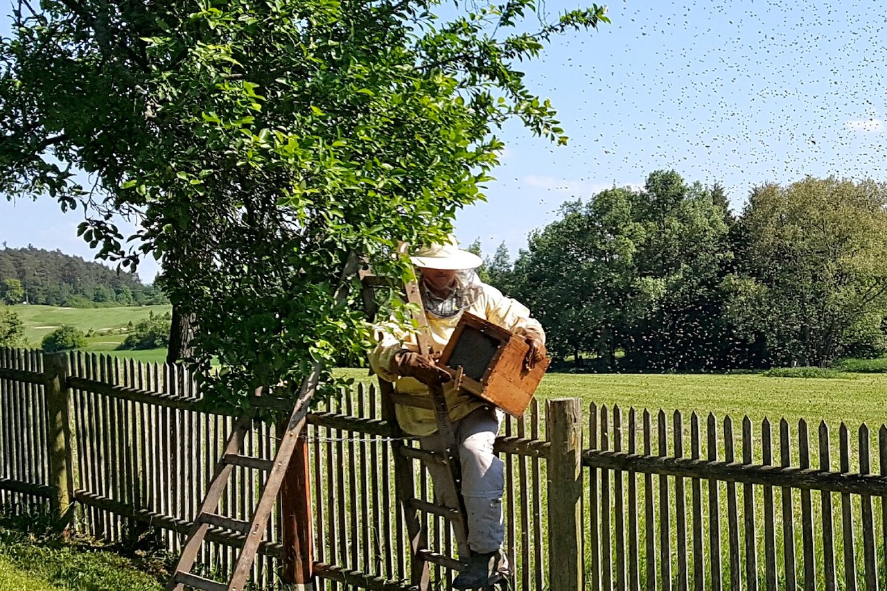 Ein Volk Honigbienen kann bis zu 150.000 Angehörige haben und 20 bis 100 Kilo Honig pro Jahr produzieren. Ein Honigschlecken ist das Bienenwesen dennoch nicht. Vielmehr harte Arbeit, die verantwortungsbewusste Imker wie Horst Kämpfer zu dieser Jahreszeit zwölf Stunden am Tag auf Trab hält, um die Stöcke zu pflegen oder neu sich bildende Völker wieder einzufangen, und bis in den August tägliche Betreuung der Bienenkisten erfordert. Demnächst beginnt das kräftezehrende Ausschleudern der Waben – vor das Vergnügen des Honiggenusses haben die Götter bekanntlich den Schweiß gesetzt.