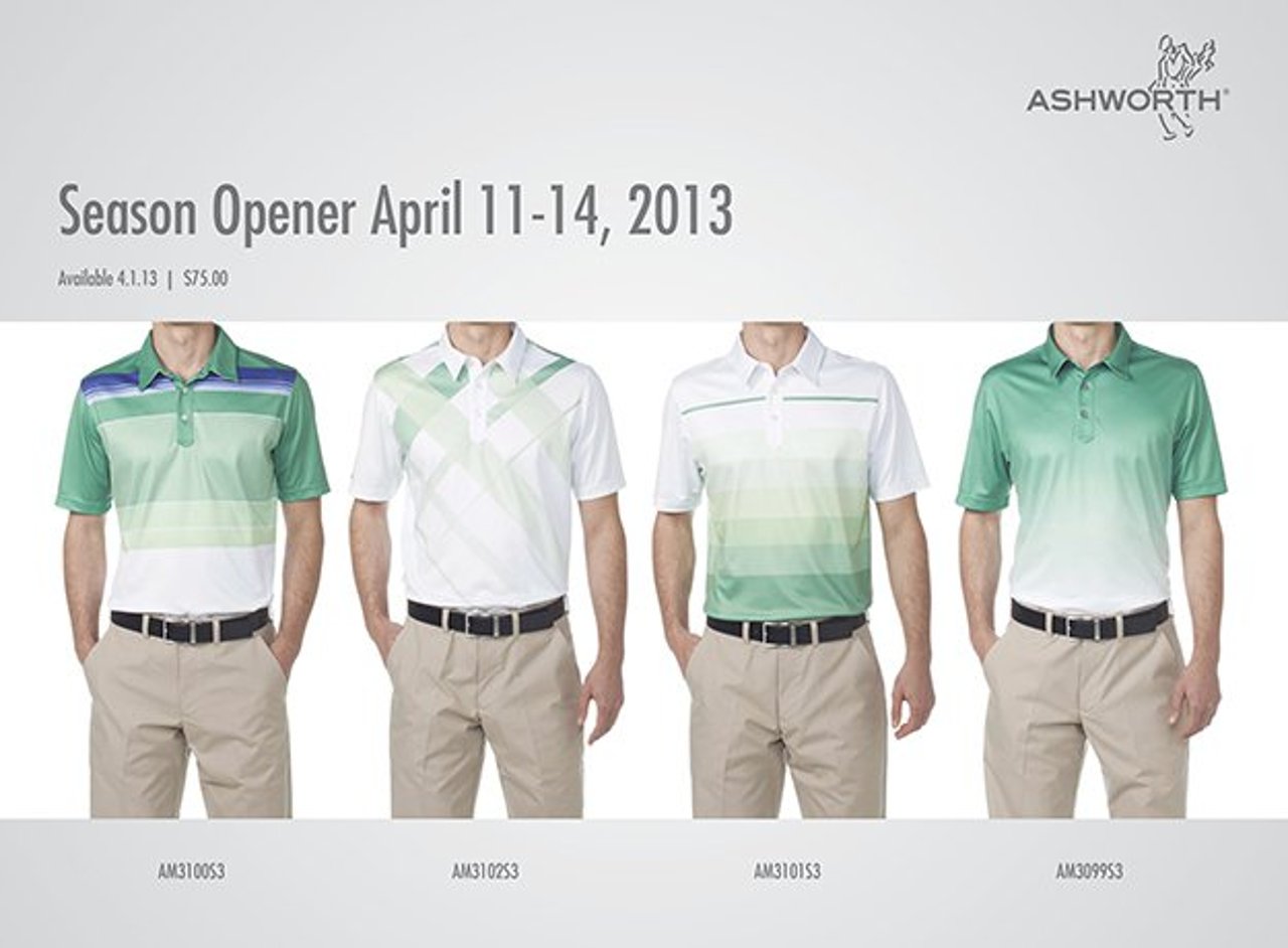Dezent hält es Ashworth mit pastellgrünen Streifen, Karos und Farbverläufen. Bei der Präsentation der Bekleidung gab Nike bekannt, dass man frühzeitig mit den Golfern abspricht, welchen Style und welche Farben sie für ihre Outfits bevorzugen, in denen die Majorturniere bestreiten werden.