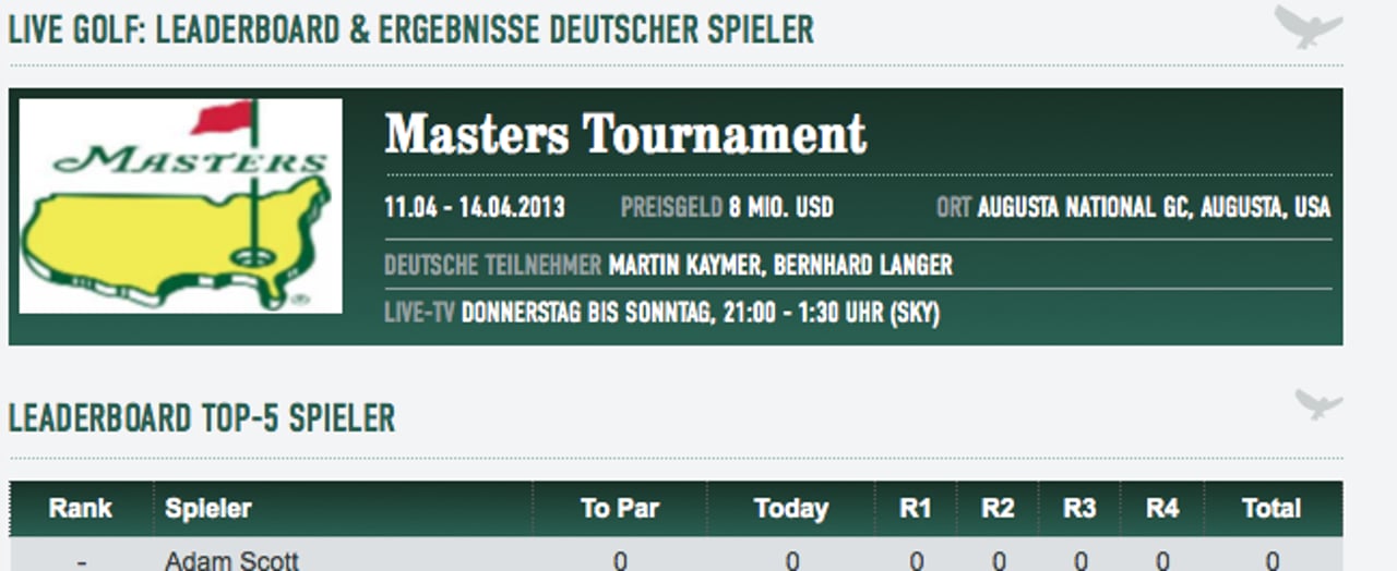 Nichts verpassen: Deutsche Spieler und andere wichtige Akteure werden im Element Spieler im Fokus detailliert mit ihren Loch-für-Loch-Scores verfolgt, inklusive farbliche Untermalung von Eagle bis Doppelbogey. Ganz links auf schwarzem Grund wird die Position des Spielers im Teilnehmerfeld angezeigt, rechts daneben der Name und ein Foto des Spielers. Unter "R1" bis "R4" können die bis dato gespielten Runden des Spielers Loch für Loch nachvollzogen werden.