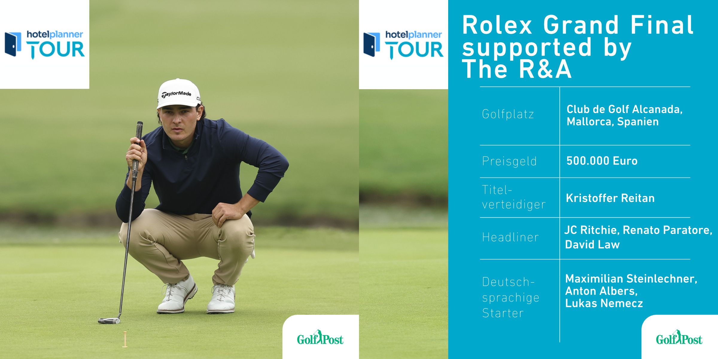 Auch wenn es im Herbst im internationalen Turnierkalender etwas ruhiger wird, geht es bei der HotelPlanner Tour an diesem Wochenende um Alles. Auf dem Platz des Club de Golf Alcanada auf der balearischen Insel Mallorca, lockt das große Finale der HotelPlanner Tour die Fans auf die Insel. Die Liste der Road to Mallorca findet an diesem Wochenende seinen Höhepunkt und die besten Spieler der HotelPlanner Tour messen sich im Finale in Port d'Alcúdia. Besonders im Fokus steht der Österreicher Maximilian Steinlechner, der auf der Road to Mallorca auf Ranglistenplatz 2 steht und gute Chancen hat, sein Können in Spanien nun unter Beweis zu stellen. Neben dem attraktiven Preisgeld in einer Gesamthöhe von 500.000€ winken 20 Tickets für den Aufstieg in die DP World Tour. Der ebenfalls österreichische Spieler Lukas Nemecz verpasste im vergangenen Jahr knapp den Aufstieg in die DP World Tour und steht derzeit auf der Liste der Road to Mallorca auf Platz 19. Der Hamburger Anton Albers startet auf dem 21. Platz der Rangliste und hat auch gute Chancen in die herausragendste europäische Liga aufzusteigen.
