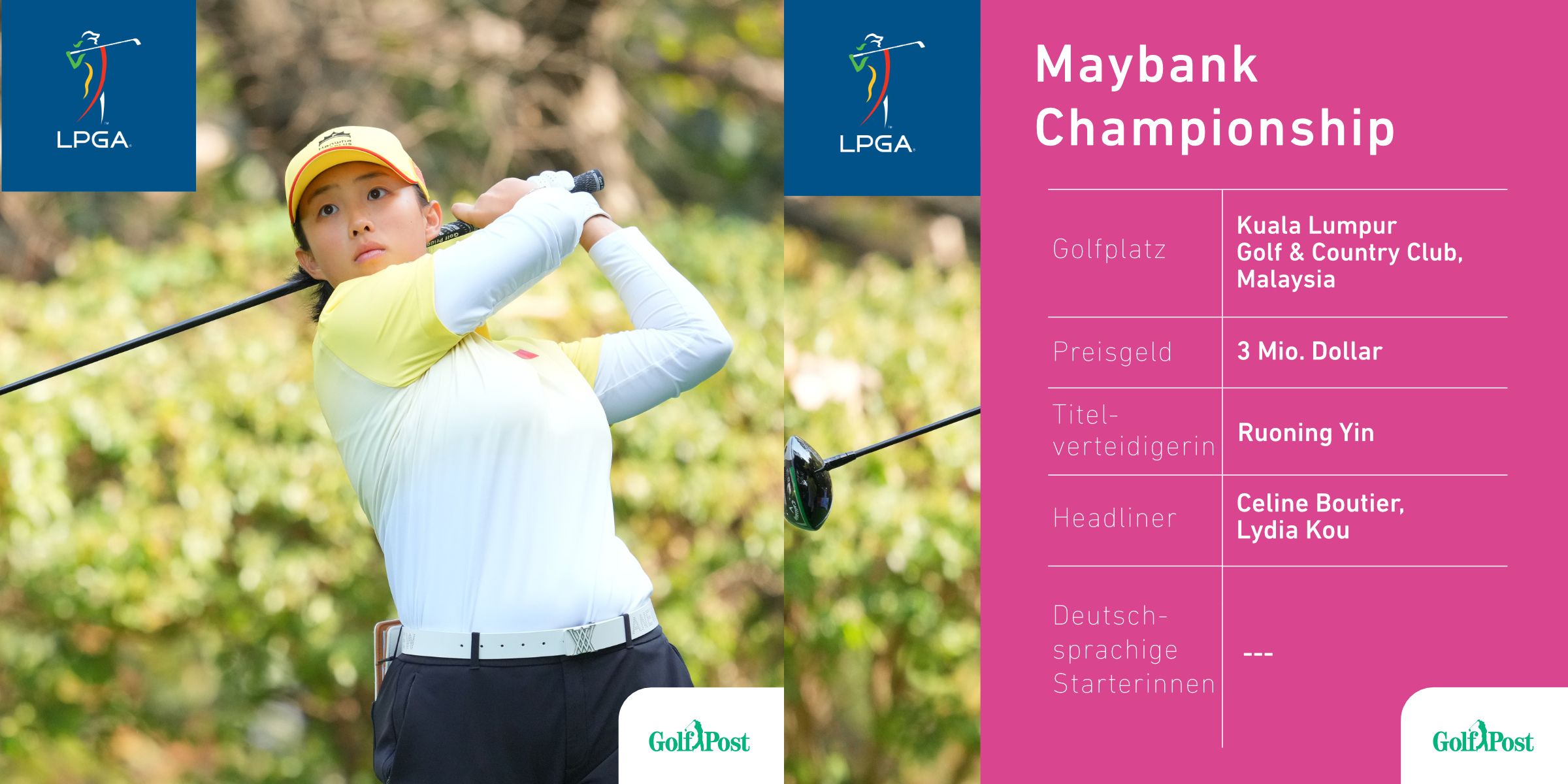 Bei der LPGA Tour startet am kommenden Wochenende die Maybank Championship in Kuala Lumpur in Malaysia. Das Turnier der Damen hat im asiatischen Raum eine hohe regionale Komponente und überzeugt mit einer hohen Teilnehmerinnenanzahl aus Südostasien. Die Sponsoreneinladungen sind ausschließlich an Teilnehmerinnen aus Malaysia und Thailand gegangen und aus dem deutschsprachigen Raum nimmt auch sonst keine Spielerin teil. Die Titelverteidigerin Yin Ruoning aus China tritt ebenso wieder an, wie die Französin Celine Boutier sowie die dreifache Majorsiegerin und Neusseeländerin Lydia Kou. Bekannt ist das mit insgesamt 3 Millionen Dollar dotierte Turnier dafür, dass es bei den vier Spieltagen keinen Cut geben wird und alle Spielerinnen am Sonntag in die Finalrunde starten.