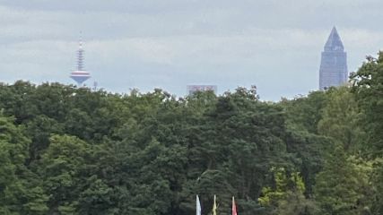 Sehr gepflegte Anlage mit tollem Baumbestand,inmitten von Flugzeugen und ein schönen Ausblick auf den Messeturm