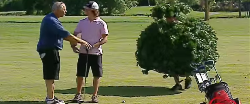 Das zweite hat im weitesten Sinne mit den Golf-Regeln zu tun. Also ein Busch, der müsste irgendwie natürlich sein, so dämmert es den meisten von uns in den dunklen Ecken des gefährlichen Golf-Regel-Halbwissens. Ein Hemmnis ist künstlich - wenn sich ein Busch aber bewegt, wird er dann zum losen Naturstoff oder zum beweglichen Hemmnis? Und wenn er auf einmal genau vor dem Ball steht, der gerade noch optimal mit freiem Blick zur Fahne lag, darf man ihn dann Wut entbrannt zu Kleinholz verarbeiten? Zum Glück für den, vermutlich, Praktikanten der unterhaltsamen kanadischen Variante von "Verstehen Sie Spaß...?" ist das nicht erlaubt - auch, wenn es absolut berechtigt wäre!